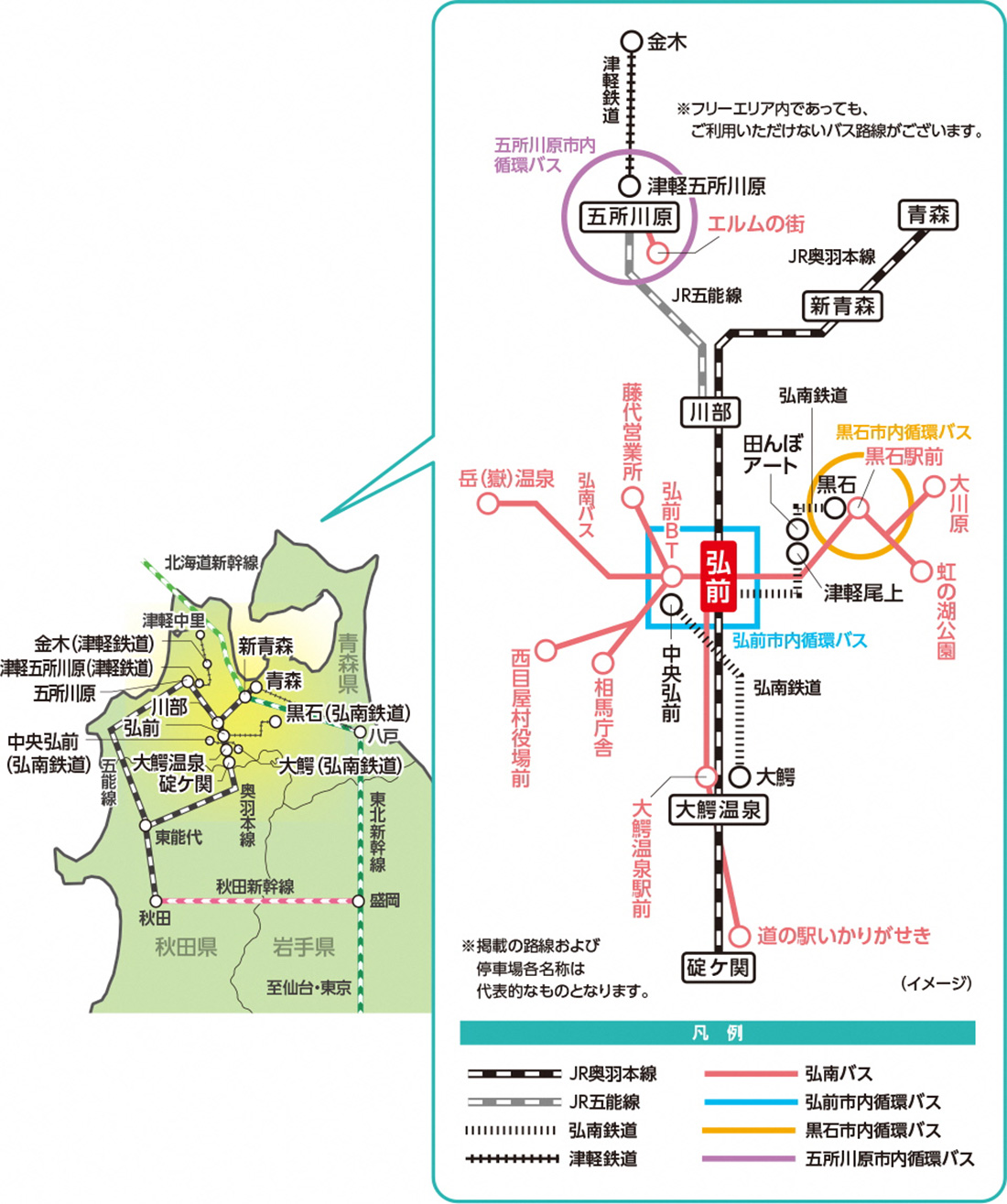 フリーエリア内のJR東日本、弘南鉄道、津軽鉄道、(津軽五所川原~金木館)の普通列車(快速含む)の普通車自由席と弘南バスの指定区間が乗り降り自由。